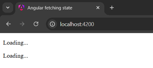 @if (fakeQuery.data$ | async; as data) { <p>{{data}}</p> } @if (fakeQuery.loading$ | async) { <p>Loading...</p> } @if (fakeQuery.error$ | async; as error) { <p>{{error.error.message}}</p> } @if (failingFakeQuery.data$ | async; as data) { <p>{{data}}</p> } @if (failingFakeQuery.loading$ | async) { <p>Loading...</p> } @if (failingFakeQuery.error$ | async; as error) { <p>{{error.error.message}}</p> }The result should be the following:
