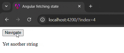 DUMMY_DATA, every time some button is clicked. We achieve this by updating query params in our url when hitting the button. So, in the component, we add a handlernavigatefor the button click event:import { Router } from '@angular/router'; ... router = inject(Router); // This updates the url to /?index={some-number} navigate() { this.router.navigate([], { queryParams: { index: Math.floor(Math.random() * this.DUMMY_DATA.length), }, }); }Now we need an observable that emits the query params of the loaded route. For that, we use Angular's injectable service