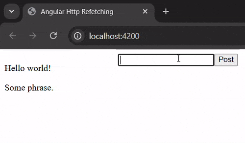 addPhrase(input: HTMLInputElement) { postPhrase(input.value).subscribe({ complete: () => { this.queryService.refetchQuery('phrases'); input.value = ""; }, }); }}In the template, we display the list of phrases on the left and an input plus button on the right. The handler from above gets bound to the button: